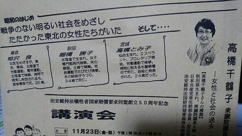 「治安維持法犠牲者 国家賠償要求同盟 創立50周年記念 講演会」 11月23日秋田駅東口「アルヴェ」で高橋千鶴子衆議院議員の講演がありました。 タイトルは「女性と社会の過去・現在・未来」で主に私たち女性同盟員が対象の学習会という位置づけでしたが、男性も若い人たちも大勢参加 して席が確保できないくらいでした。 千鶴子さんはお隣の青森県の同盟本部顧問をされていて、代議士になられる前から、紙芝居を作ったりして 治安維持法って?・先輩たちはどうたたかったの?・現在の共謀罪に通じる内容は?…などみんなで学習してこられたそうです。 千鶴子さんが大館 桂高校在学中に作家の山崎朋子が女子高校生たちに講演したことがきっかけで「からゆきさん」といった女性の悲しい人生の歴史を学んだことが 、この活動に繋がっていると言われました。 今回のテーマは「昭和のはじめ、戦争のない明るい社会をめざし、たたかった東北の女性たちがいた。 そして・・・」というイントロダクションで、治安維持法の犠牲者である、青森の相沢良、秋田県の棚橋勝子、宮城県の高橋とみ子の3人を紹介 してくれました。 ![]() 残虐極まる政府・特高に屈せず闘って20~30代で命を奪われた彼女たちに共通していることは①労働者の中で一緒に働きながら信頼を勝ち得て 組織していった。②組織することは即ちスパイなどの暗躍を許し危険を拡大してしまう。しかしけっして恐れなかった。③想像を絶する拷問に あっても正しいことは次の世代が引き継いでくれると確信の源流を見出し、どんなものからも学ぶことを忘れなかった。~~このことを私たちは 教訓にしたいと思います。 そして今年のノーベル平和賞のテーマに性暴力が選ばれた意味も教わりました。ちょうど1年前にニューヨークタイムズ 紙が、大物映画プロデューサーによる悪質なセクハラ行為を暴露し、その報道をきっかけに性的被害を告発する「#Me Too」運動が世界中に拡散 した事実が土台にあることは納得がいきます。 さらに千鶴子さんは戦争直後の1945年9月に、経済学者の都留重人と米の外交官であるハーバート・ ノーマンが憲法学者の鈴木安蔵に憲法改正案の作成を求めたことを教えてくれました。鈴木安蔵とは福島県小高出身で映画「日本の青空」(2007年) の主人公になった人です。鈴木は明治時代に40件以上も出された憲法草案も参考にしたとのこと。その一つ日本共産党の憲法草案骨子は 1945年11月11日に公表して、原本は手書きのガリ版擦りで外務省外交史料館と米国公文書館に保管されているそうです。 その13条:公務員による 拷問および残虐な行為は絶対に禁止される。27条:女子は法律的、経済的、社会的および文化的諸分野で男子と完全に平等の権利をもつ。… これらの条文は、ベアテ・シロタさんの考えと共通です。このことで私も「先輩たちの命がけのたたかいを引き継いで、次の世代へ平和と民主主義 の社会を引き継ぐために」残りの人生を頑張っていこう!と勇気をもらいました。 |