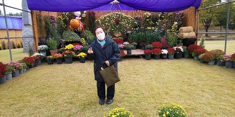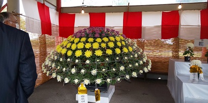 10月31日、秋晴れの朝、ふるさと村の彫刻広場で恒例の菊まつりが始まりました。